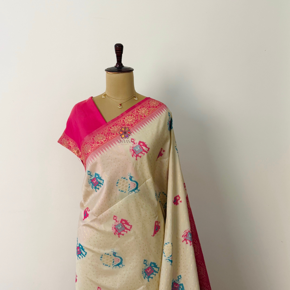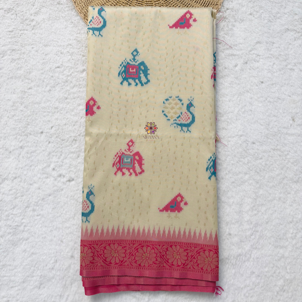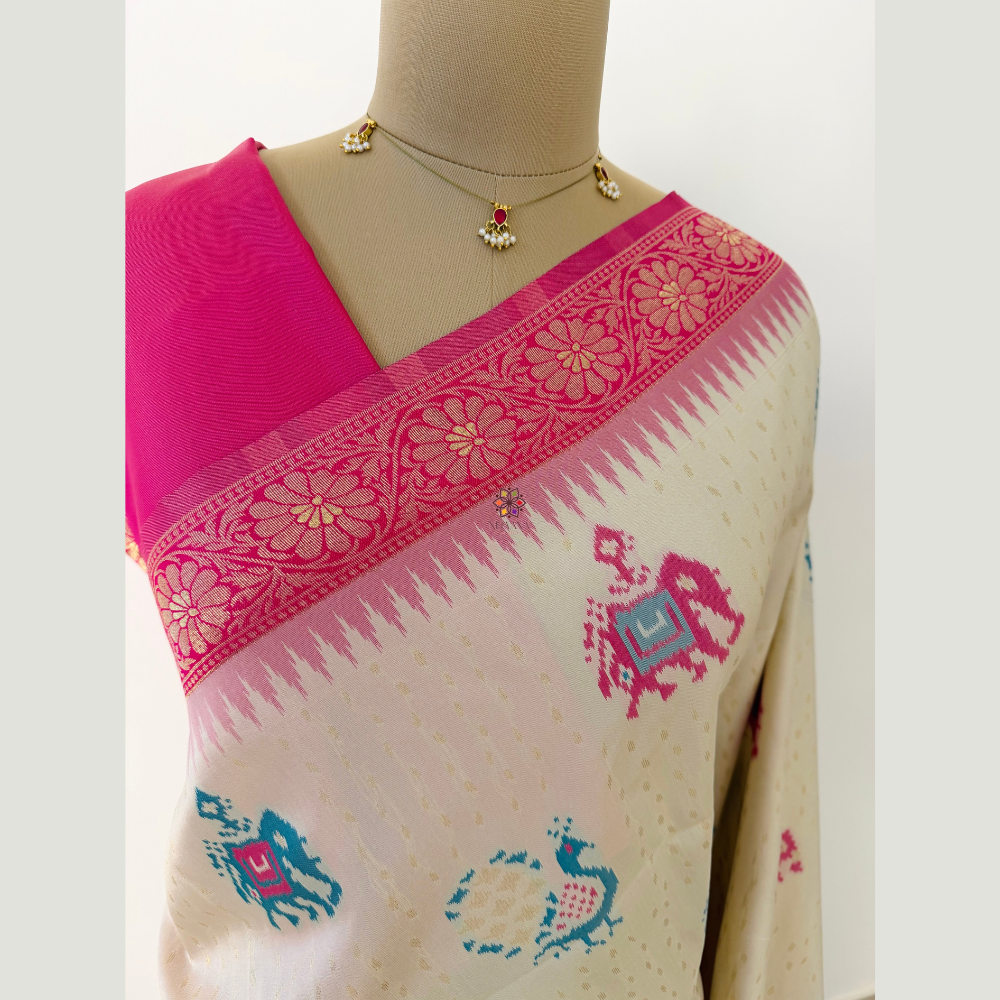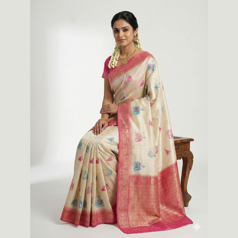 Pallu: A striking royal blue contrast pallu featuring traditional gold borders and finished with elegant hand-knotted tassels (Jhumar).